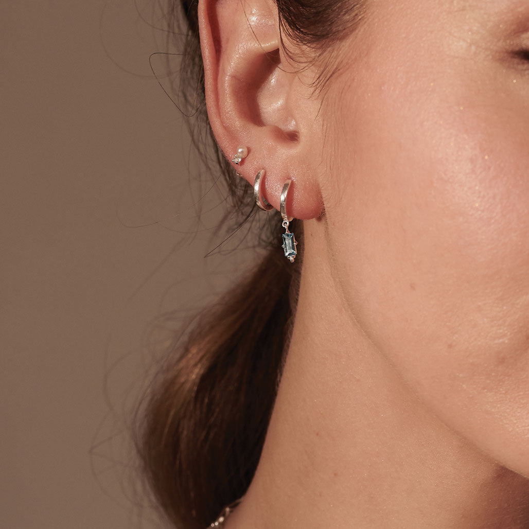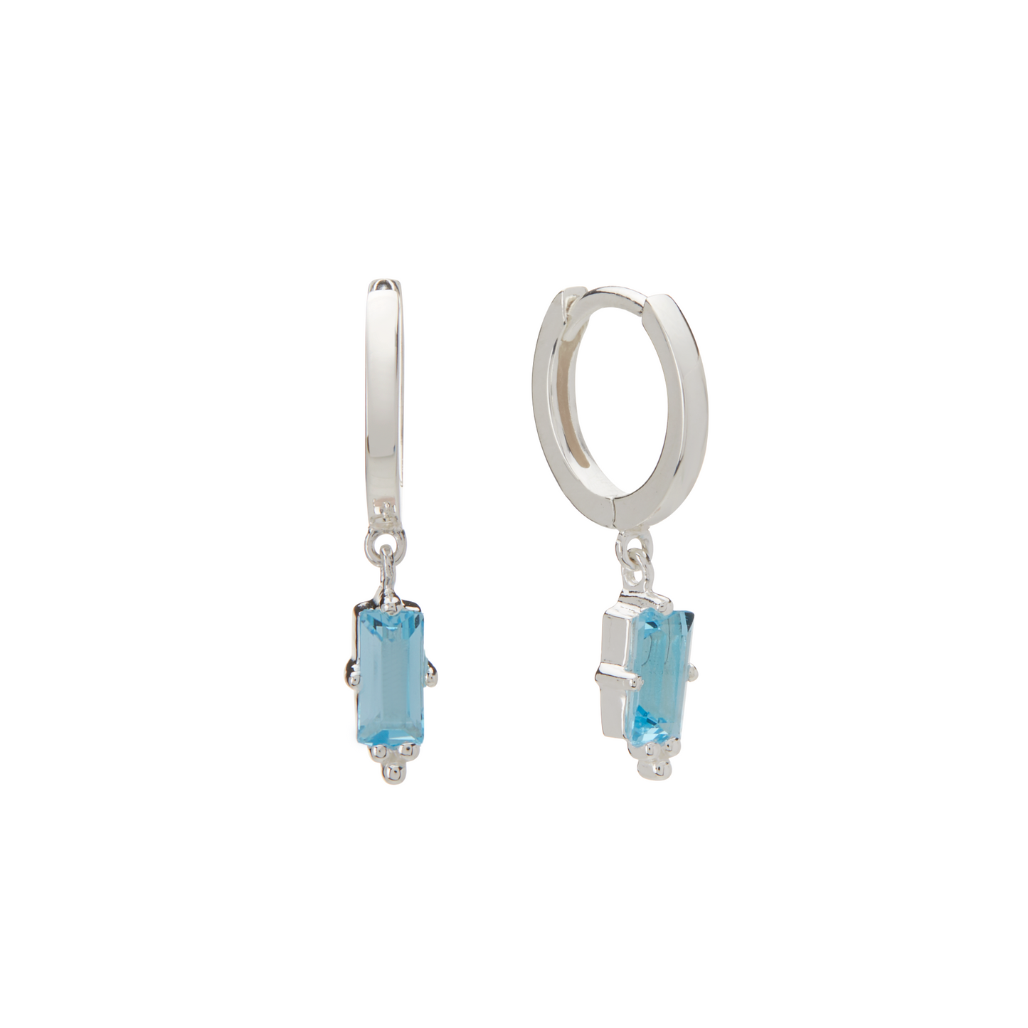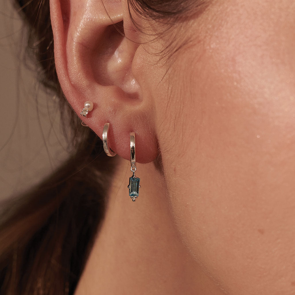 This new Huggie with Hanging Blue Topaz Baguette is part of our Petites Collection of luxe ear layering featuring Amethyst, Pink Quartz, Rose Quartz, Garnet, Peridot and Blue Topaz.