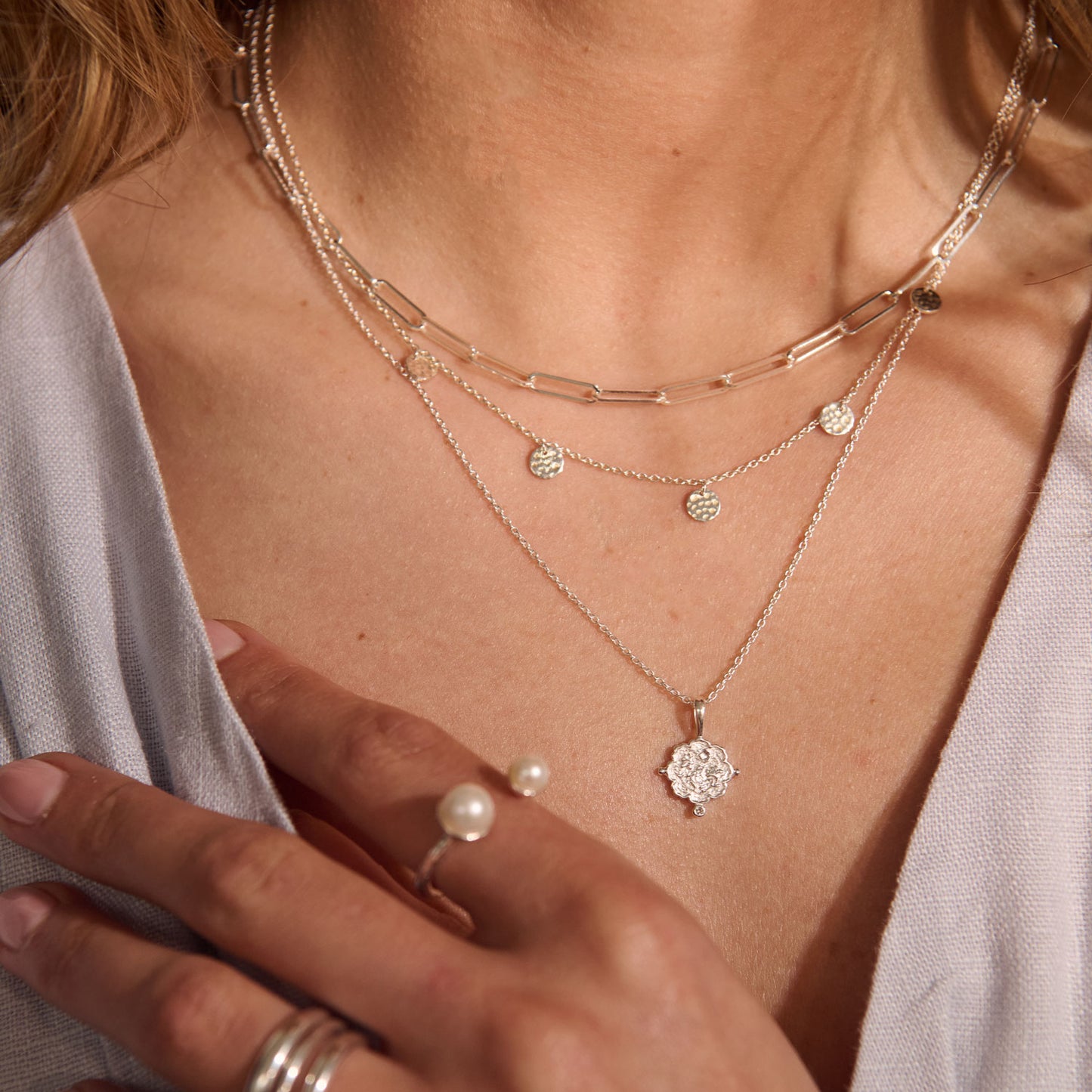 The Loved Always Small Pendant Necklace features sculpted detailing inspired by the lotus flowers that adorn the 16th Century Amer Fort in India and is sprinkled with White Topaz, chosen for its clarity and luminous calm. A heart, the symbol of love is inscribed on the back.
