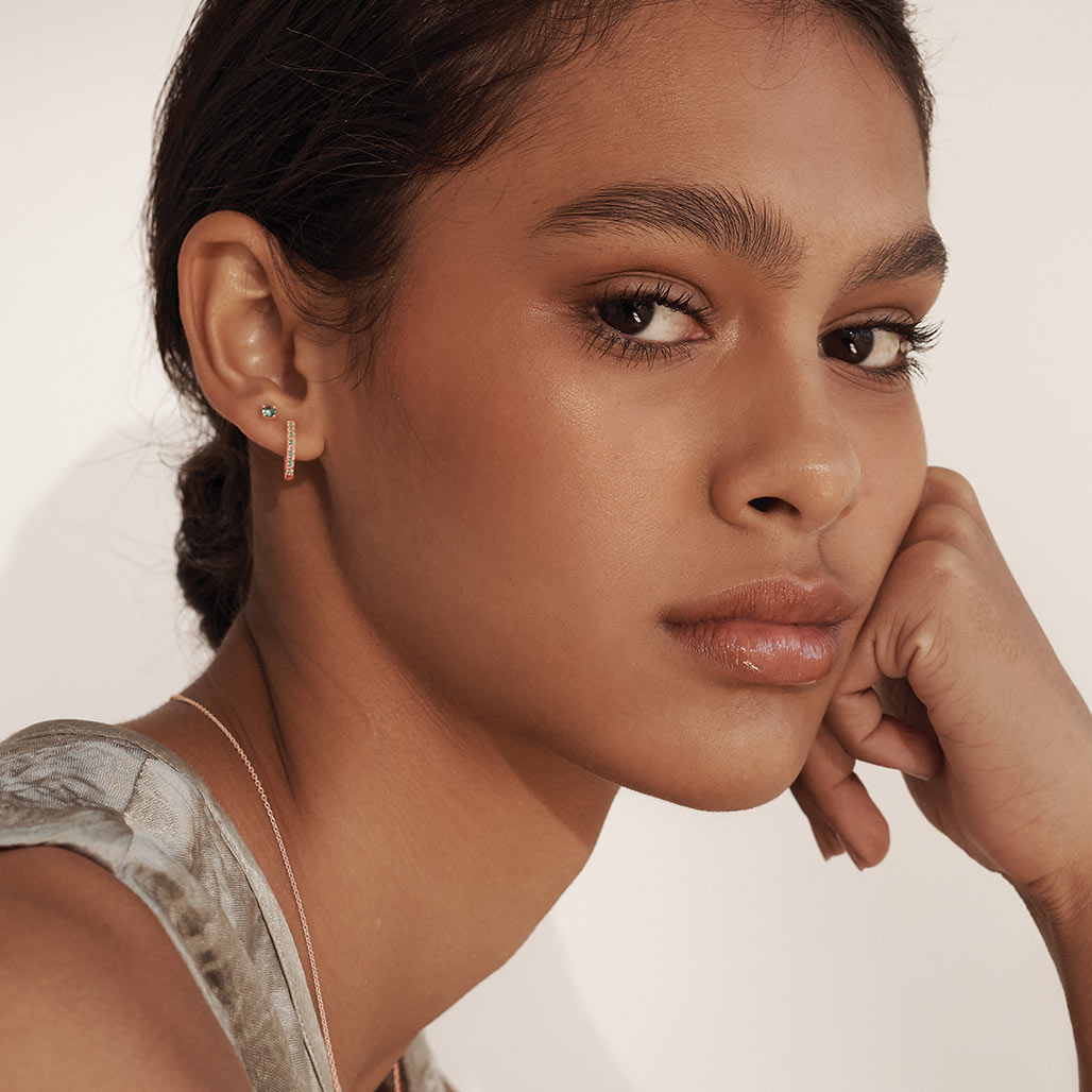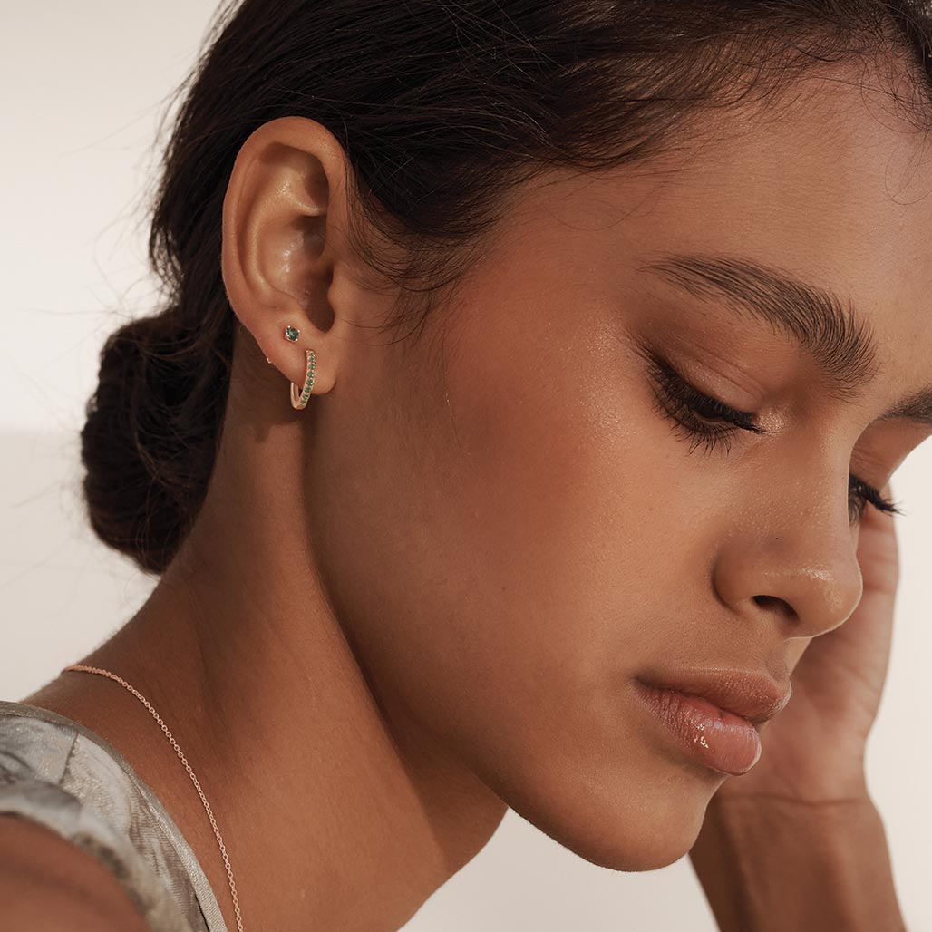 Luxe ear layering featuring Pink Rhodolite and Green Quartz.