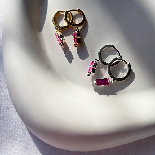 This new Rose Gold Huggie with Hanging Deep Pink Quartz Baguette is part of our Petites Collection of luxe ear layering featuring Amethyst, Pink Quartz, Rose Quartz, Garnet, Peridot and Blue Topaz.