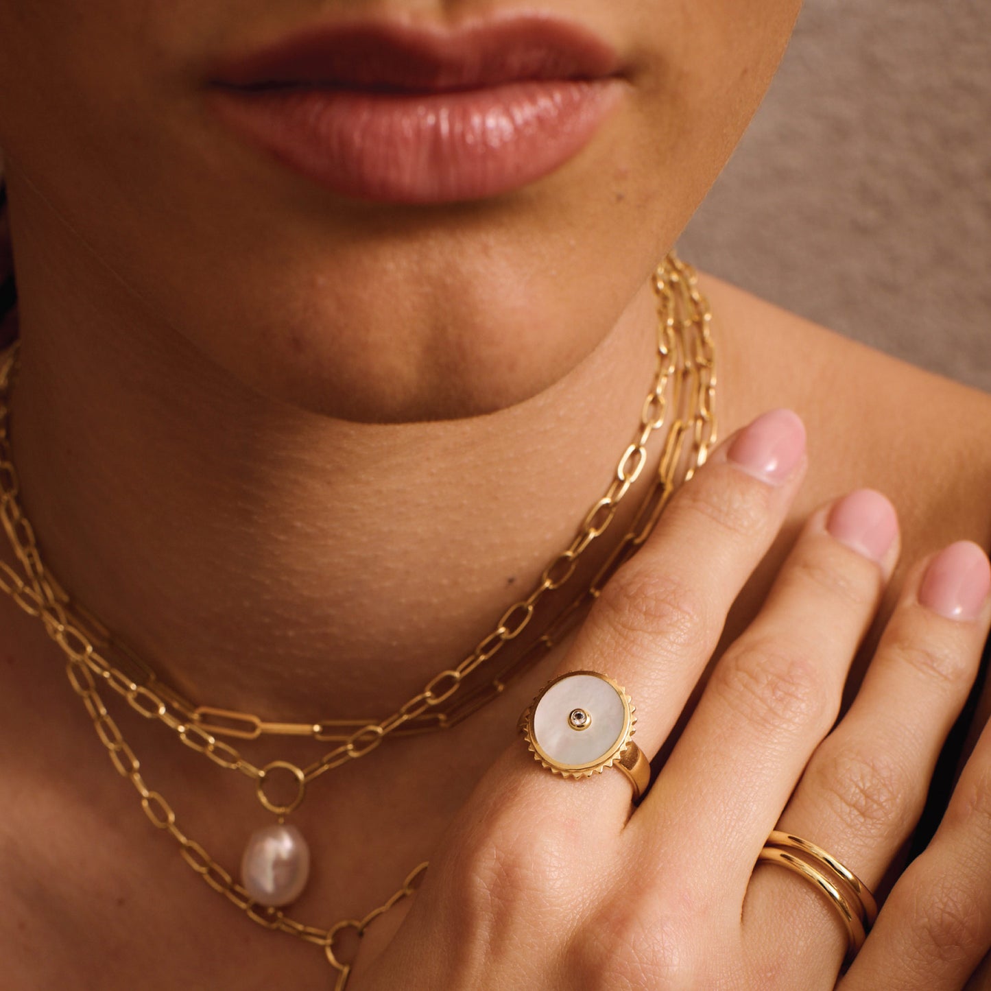 The Shield ring features stones of Mother of Pearl and White Topaz. Mother of Pearl protects the wearer from harmful energy, while White Topaz helps the wearer focus on love and offers clarity for the future. Pearls symbolise wisdom and are valued for their calming effects, helping manifest peace and strength.