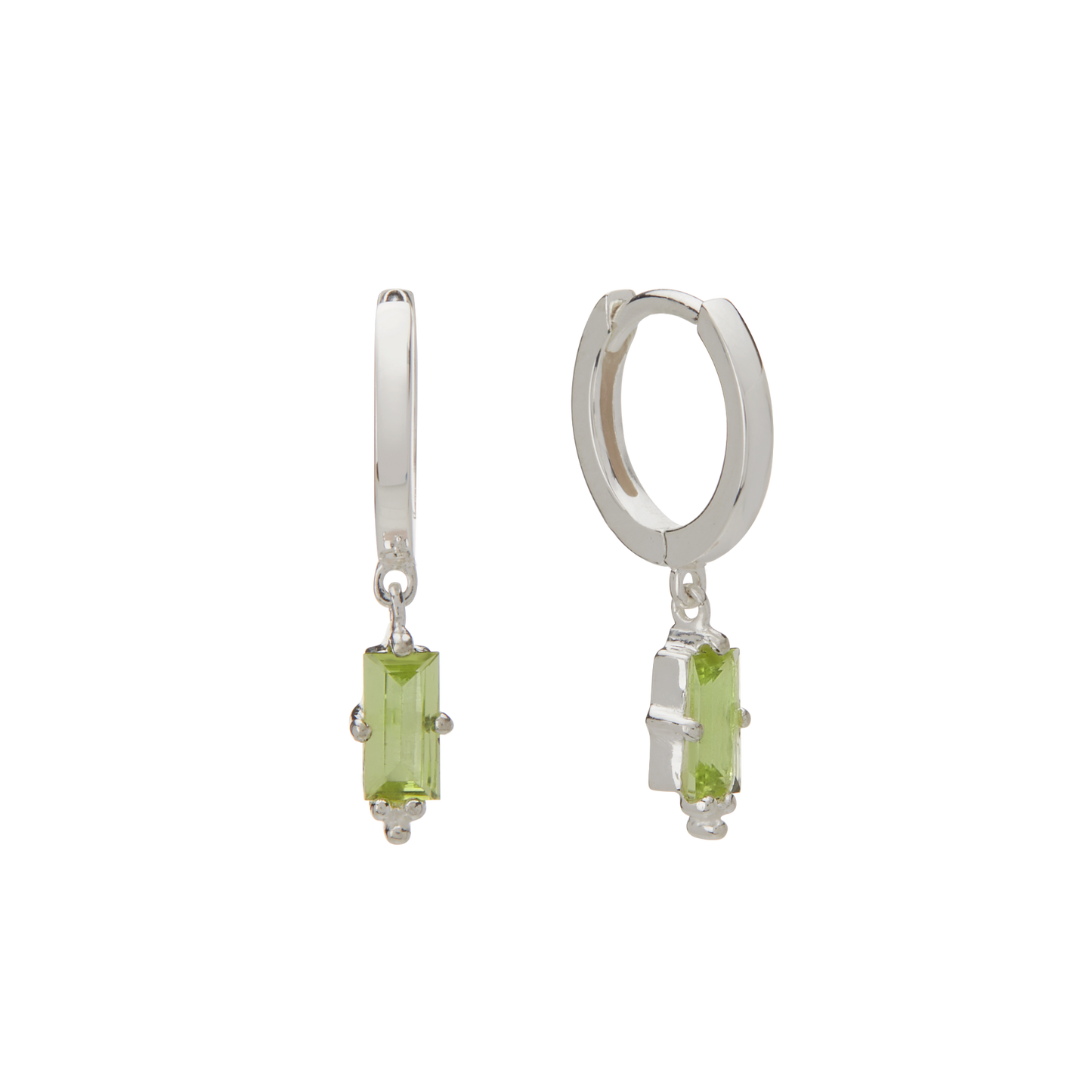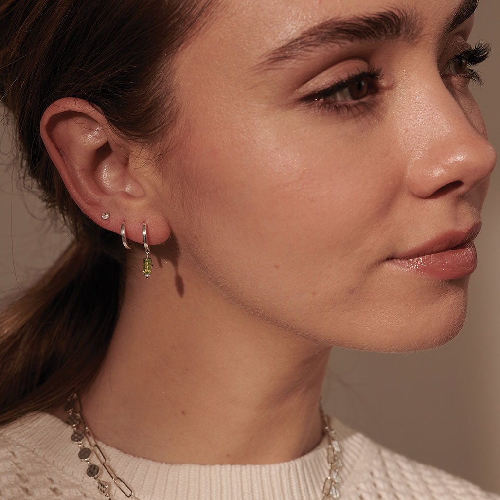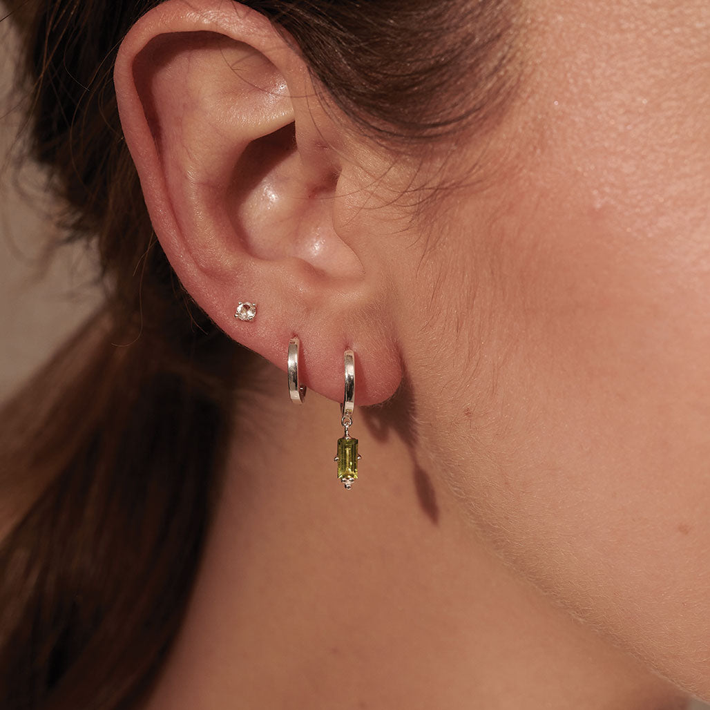 This new Huggie with Hanging Peridot Baguette is part of our Petites Collection of luxe ear layering featuring Amethyst, Pink Quartz, Rose Quartz, Garnet, Peridot and Blue Topaz.